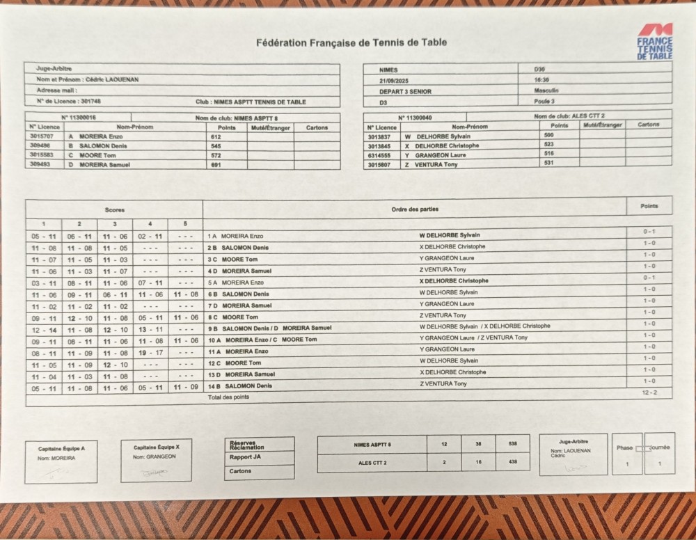Pour ce premier match de la saison, nous recevions l'équipe d'ALES 2 sur notre antenne de Sernhac. Sur "le papier" notre équipe affiche un total de point supérieur; ce qui s'est vérifié à la table, score final 12-2.Enzo en difficulté enchaîne 2 défaite avant un sursaut sur son dernier match.Denis assure ses 3 victoires (moi également).Mention spécial pour Tom pour sa victoire contre Tony V., dans un match serré avec de très beaux points, arraché à la belle grâce à son sérieux et sa volonté : BRAVO Tom